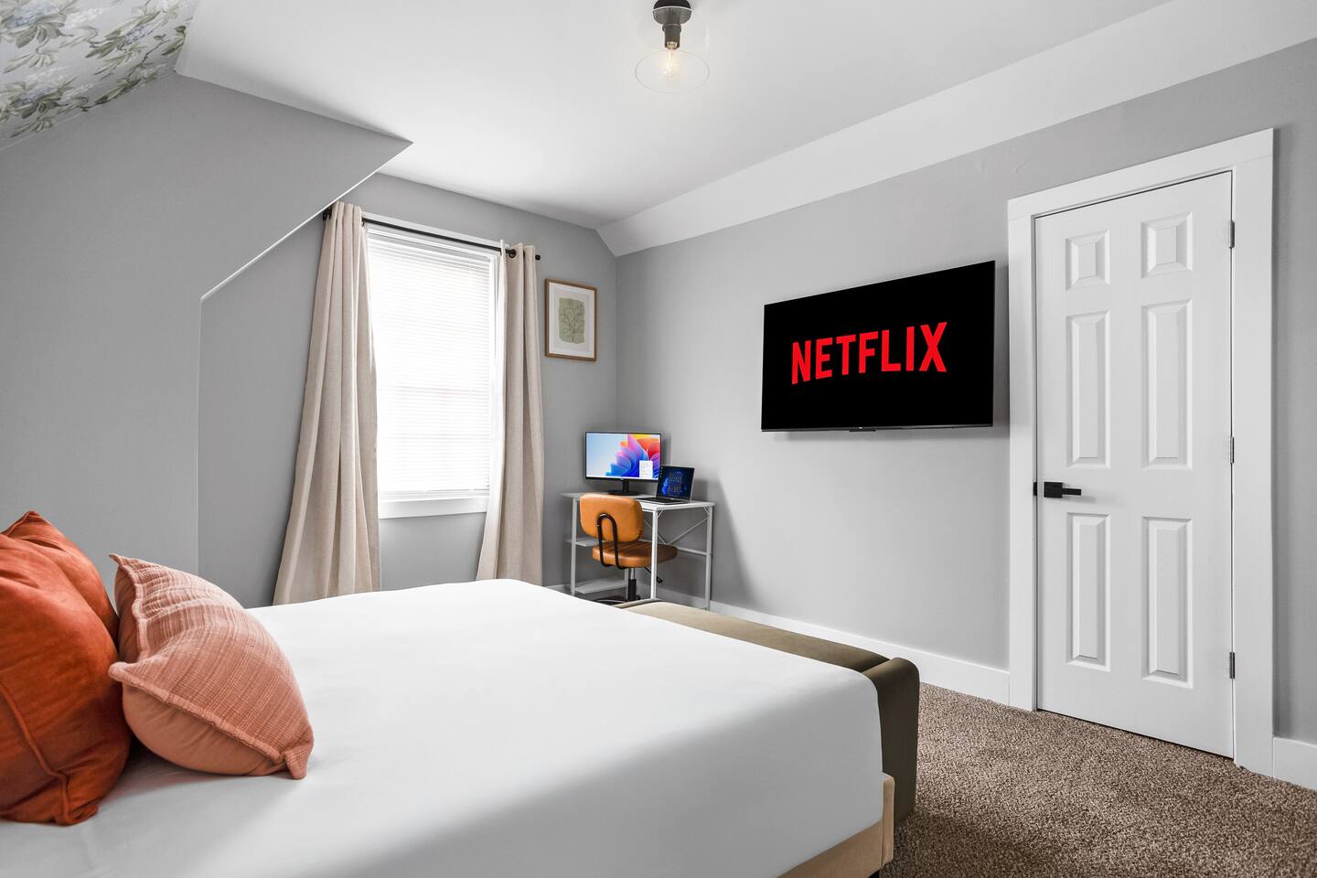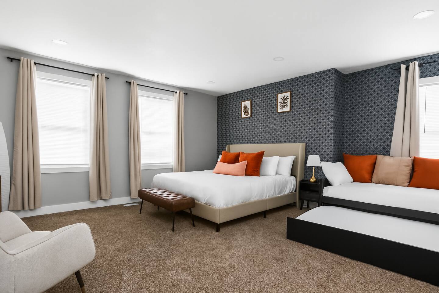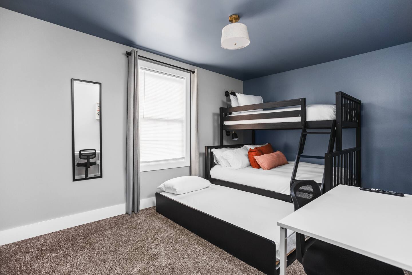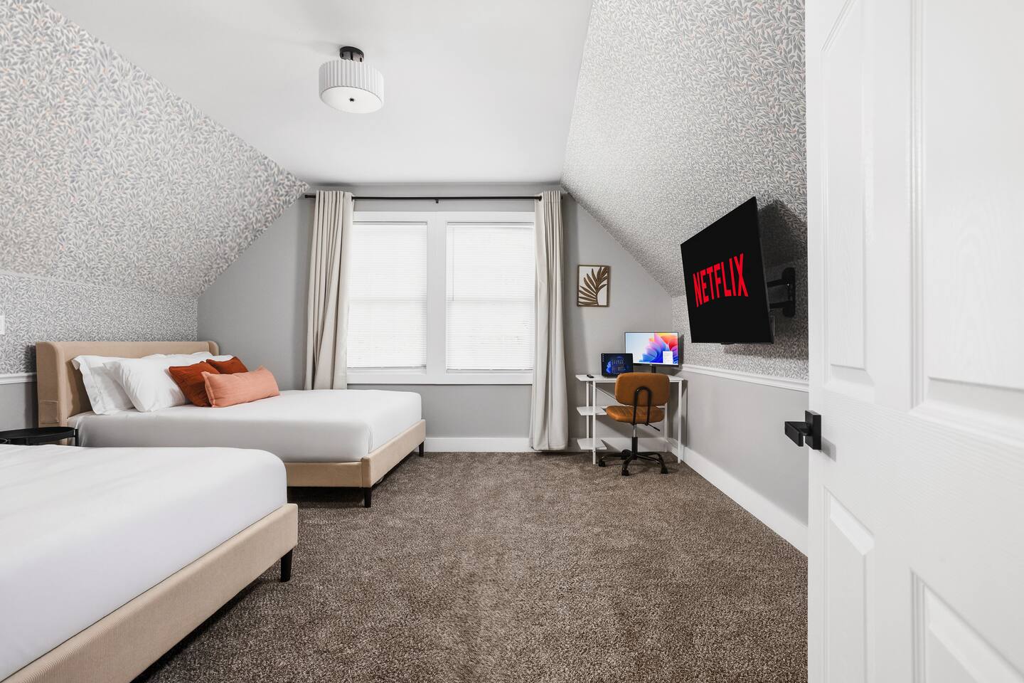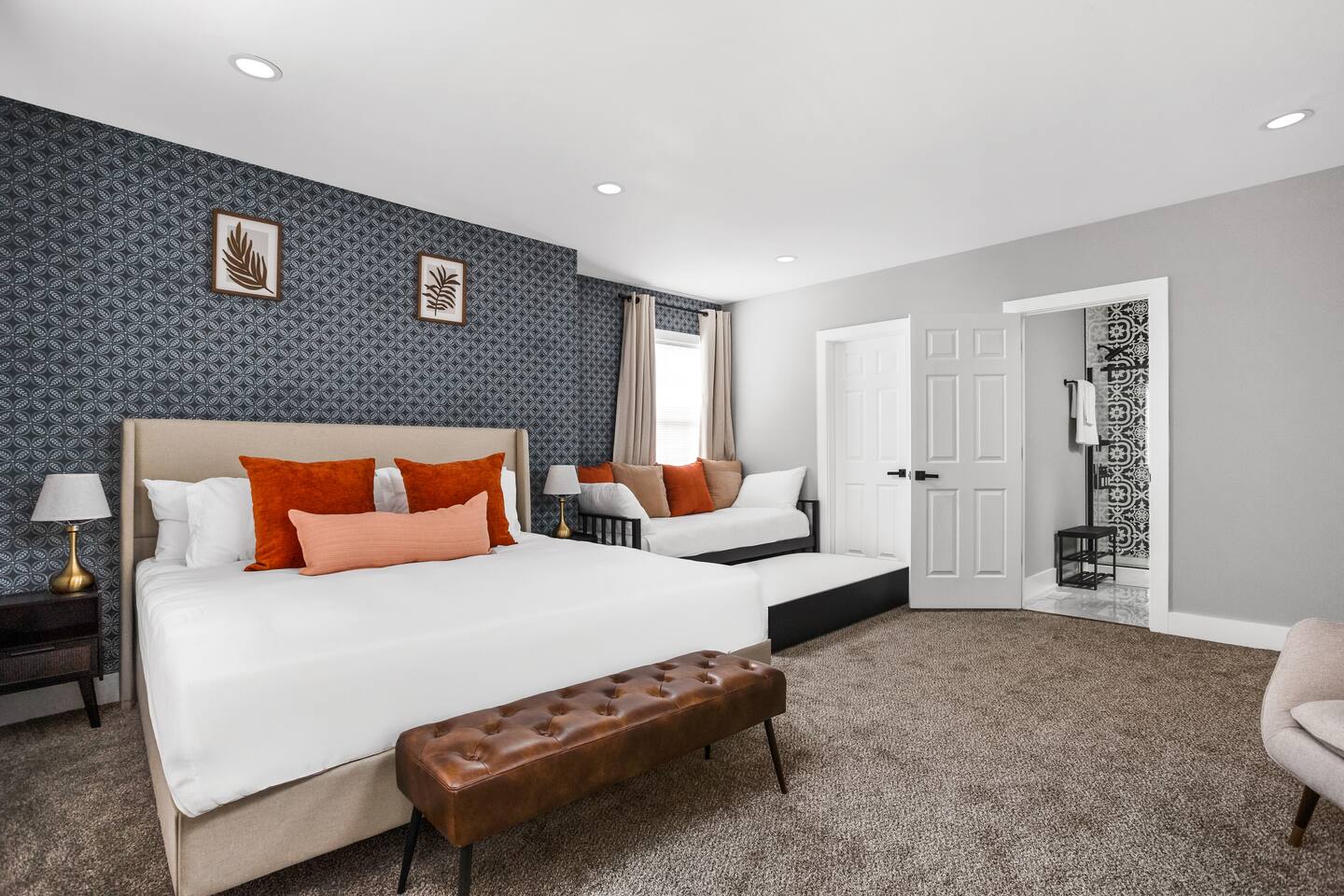Unwind in one of four thoughtfully designed bedrooms, each offering a peaceful escape with high-end furnishings, plush bedding, and elegant touches throughout. Three of the rooms feature dedicated workstations—perfect for remote work or planning your day in Indy. Beautiful accent wallpapers and full-length mirrors enhance the charm and functionality of the space. The luxurious master suite stands out with a king-size bed and a private en-suite bathroom, complete with a spacious walk-in shower for a spa-like experience.
