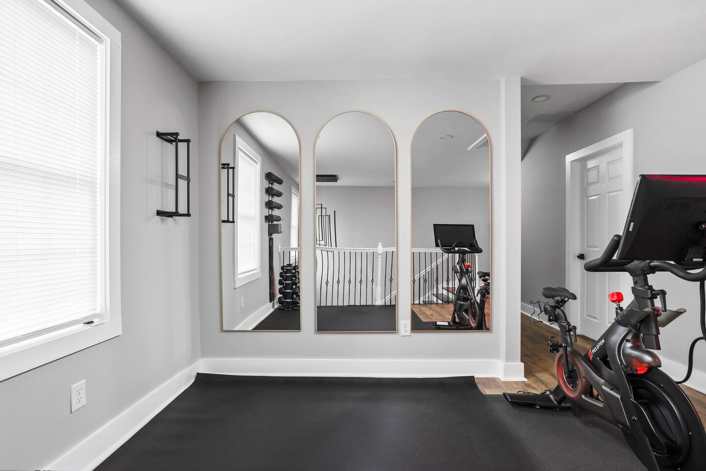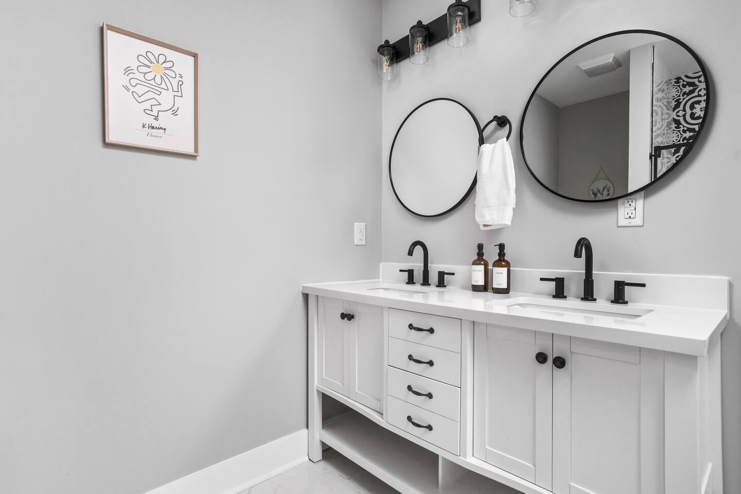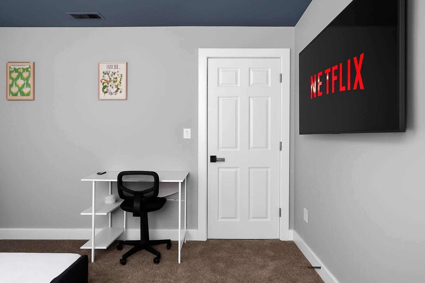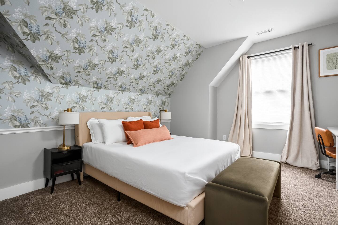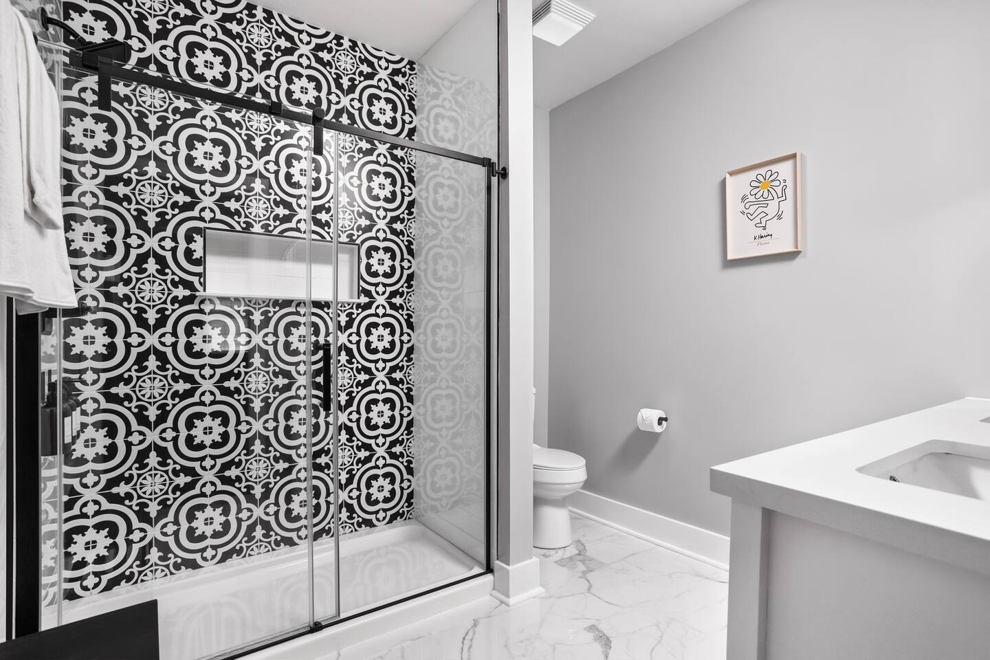 Unwind in one of four thoughtfully designed bedrooms, each offering a peaceful escape with high-end furnishings, plush bedding, and elegant touches throughout. Three of the rooms feature dedicated workstations—perfect for remote work or planning your day in Indy. Beautiful accent wallpapers and full-length mirrors enhance the charm and functionality of the space. The luxurious master suite stands out with a king-size bed and a private en-suite bathroom, complete with a spacious walk-in shower for a spa-like experience.