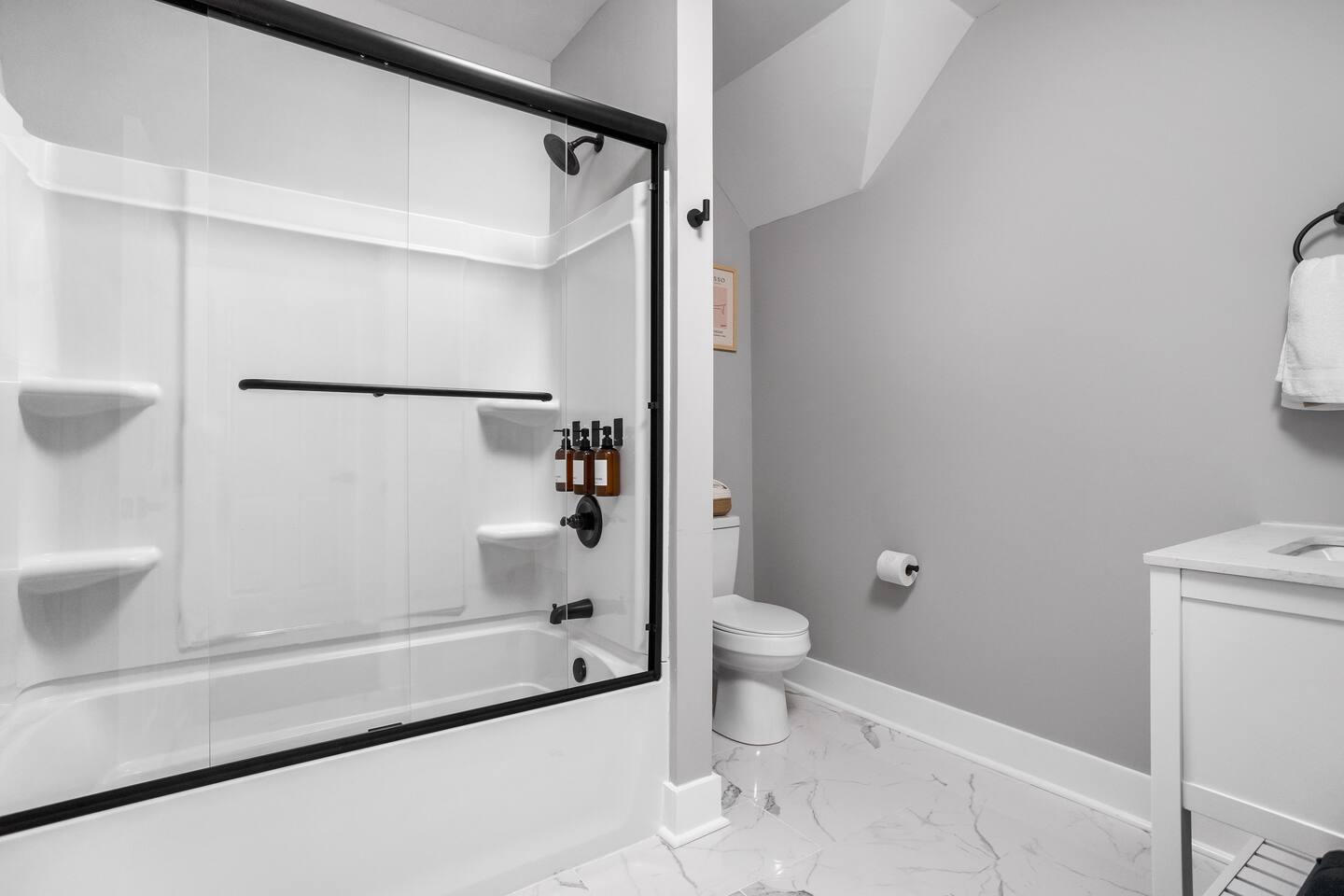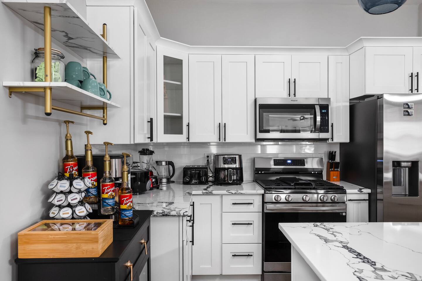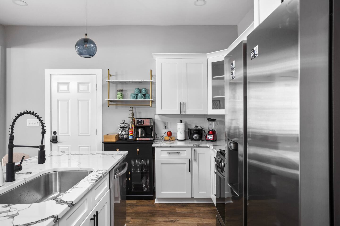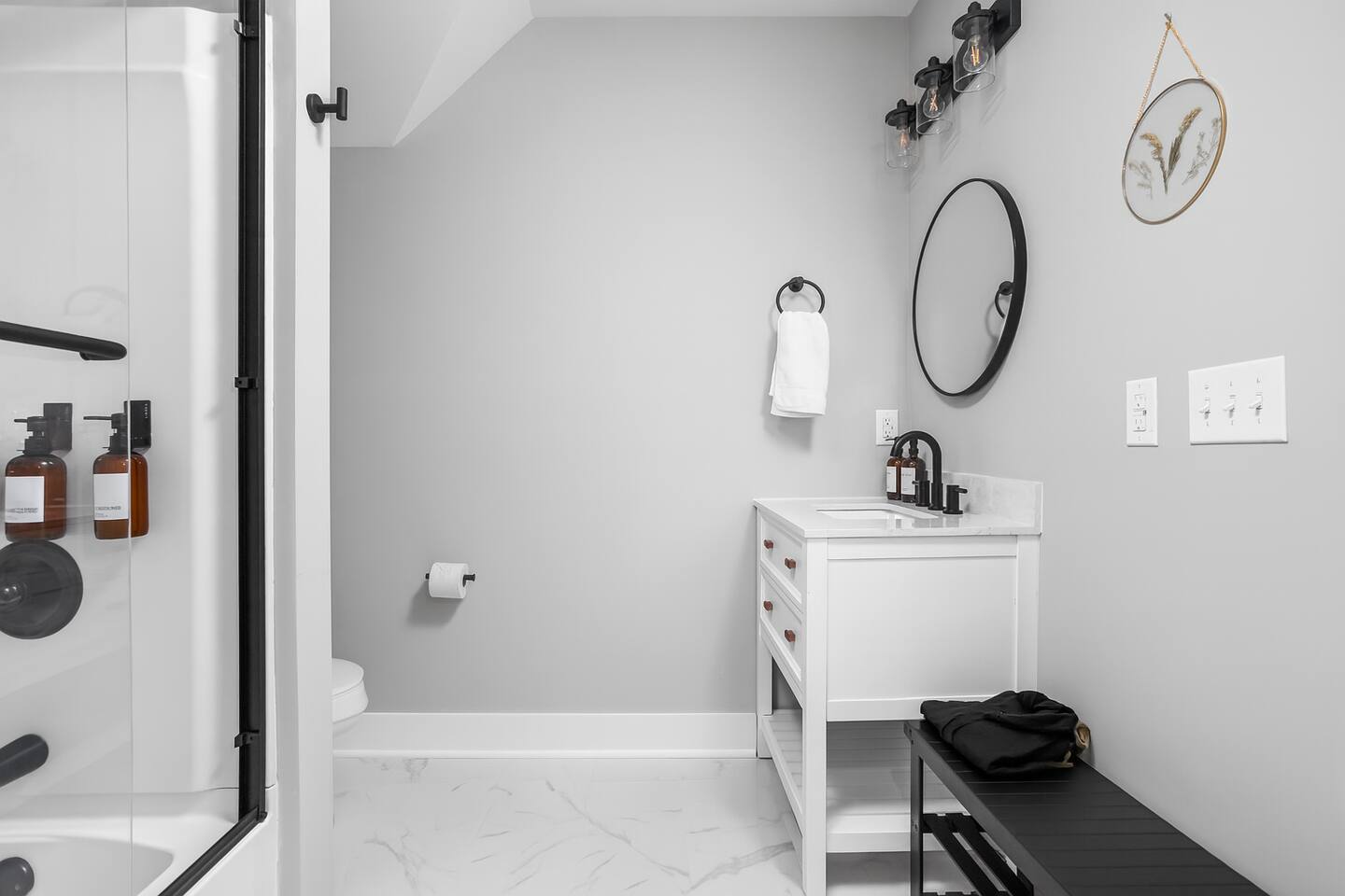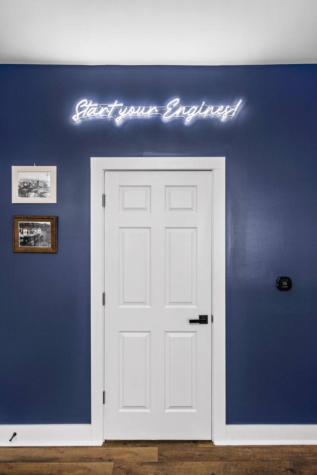 Unwind in one of four thoughtfully designed bedrooms, each offering a peaceful escape with high-end furnishings, plush bedding, and elegant touches throughout. Three of the rooms feature dedicated workstations—perfect for remote work or planning your day in Indy. Beautiful accent wallpapers and full-length mirrors enhance the charm and functionality of the space. The luxurious master suite stands out with a king-size bed and a private en-suite bathroom, complete with a spacious walk-in shower for a spa-like experience.