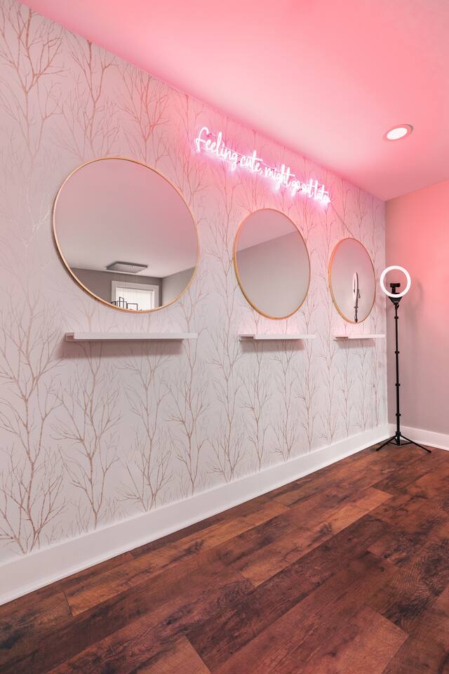 - Glam wall with mirrors to help you get ready and a selfie stand