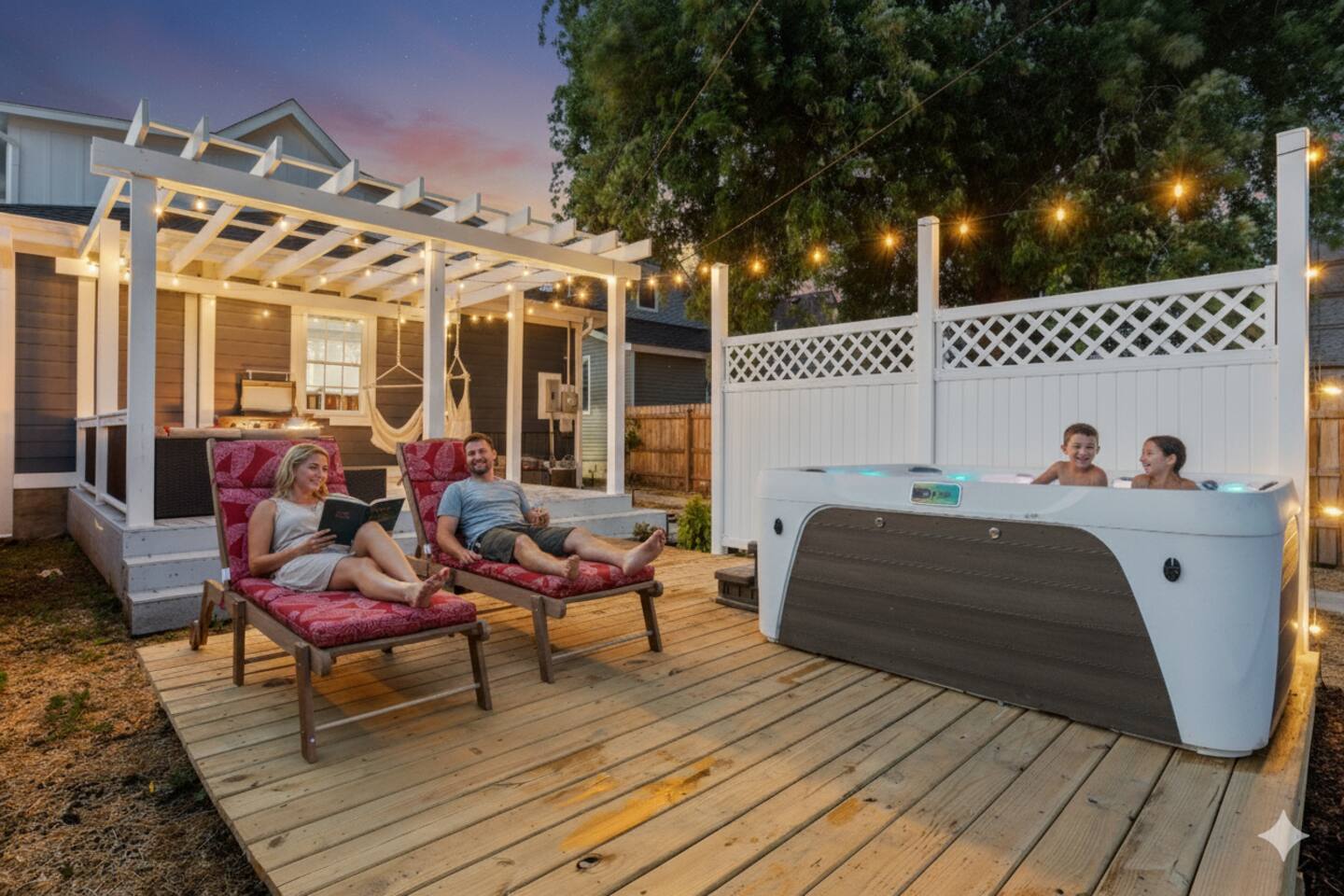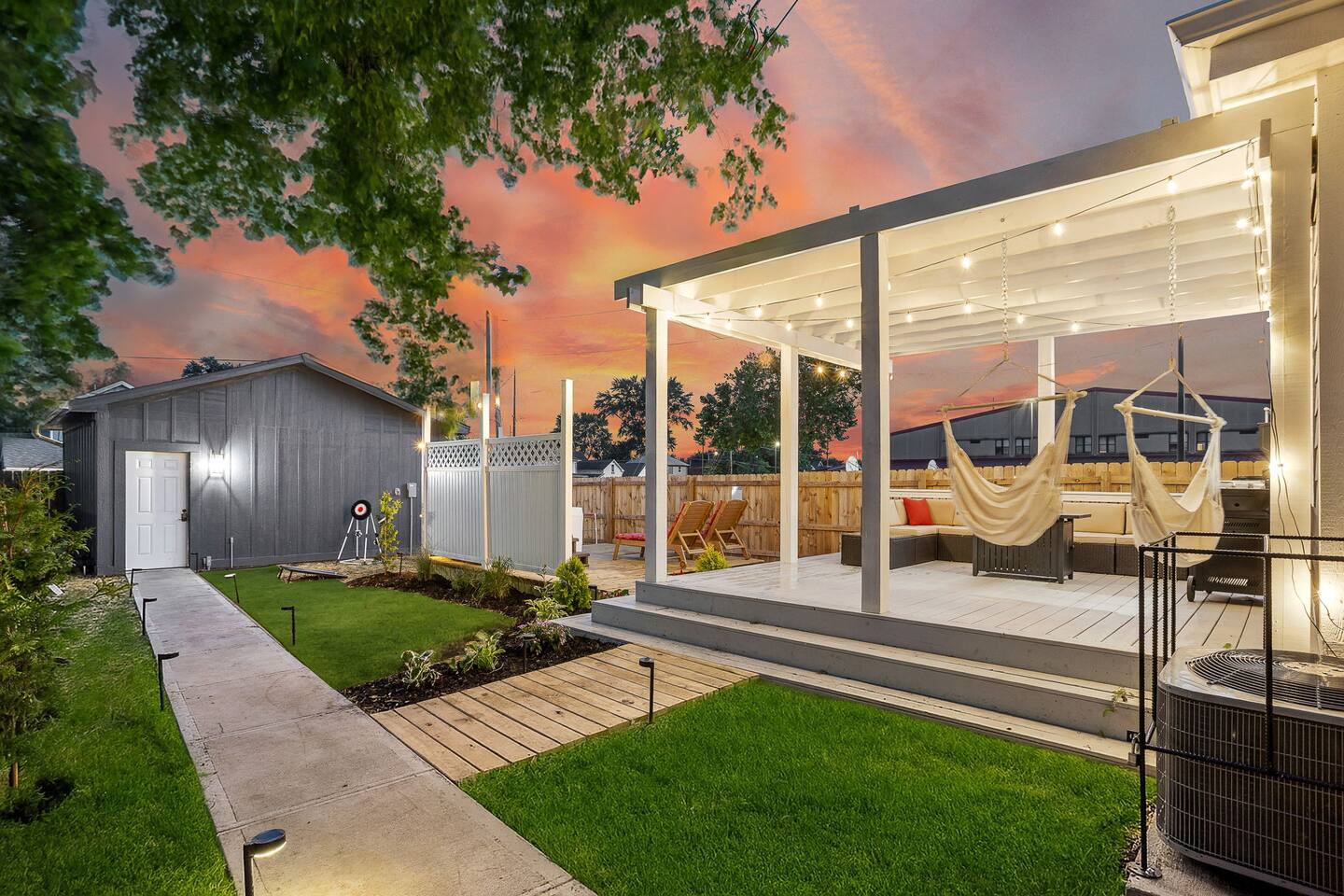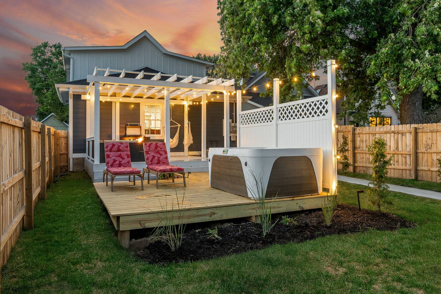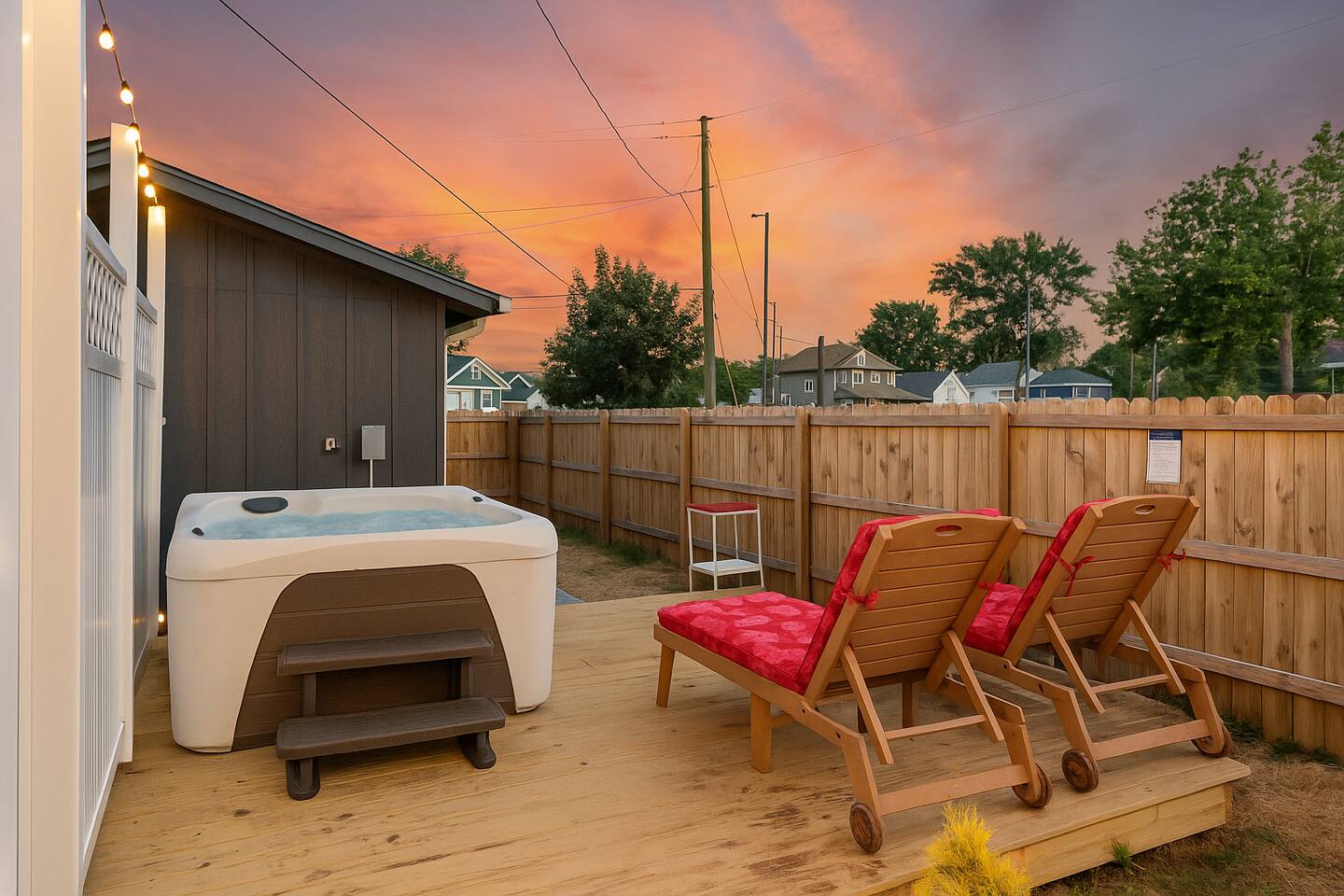 - Private backyard oasis with firepit seating, hot tub, sun loungers, swings & outdoor games